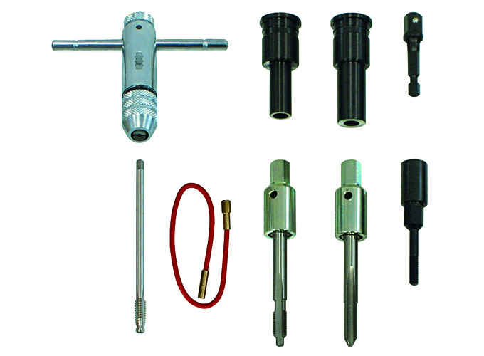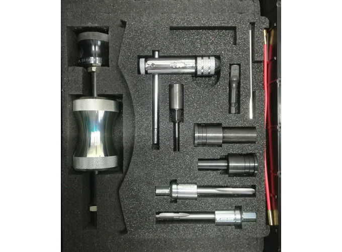 Der Universal-Glühkerzen Werkzeugsatz ermöglicht das schnelle und einfache Ausbohren von beschädigten bzw. abgerissenen Glühkerzen. Die Glühkerze bzw. der Glühkerzenkopf wird mit dem Kernlochbohrer aus- bzw. aufgebohrt. Anschließend wird das Originalgewinde mit dem Spezial-Gewindebohrer nachgeschnitten und gereinigt. Der verbleibende Glühkerzenkörper wird dann mit dem Gewindebohrer oder mit dem Zugbolzen in Verbindung mit einem Schlagauszieher herausgezogen. Der Werkzeugsatz beinhaltet zusätzlich zwei spezielle Führungshülsen für Fiat JTD Motoren und Mercedes CDI Motoren, welche eine exakte und präzise Zentrierung, Führung und Bohrtiefe gewährleisten. Passend für Glühkerzengewinde M8x1 z.B. Mercedes OM639, OM640, OM642, OM651 und Fiat 1.3 JTD, 2.3 JTD, 3.0 JTD.